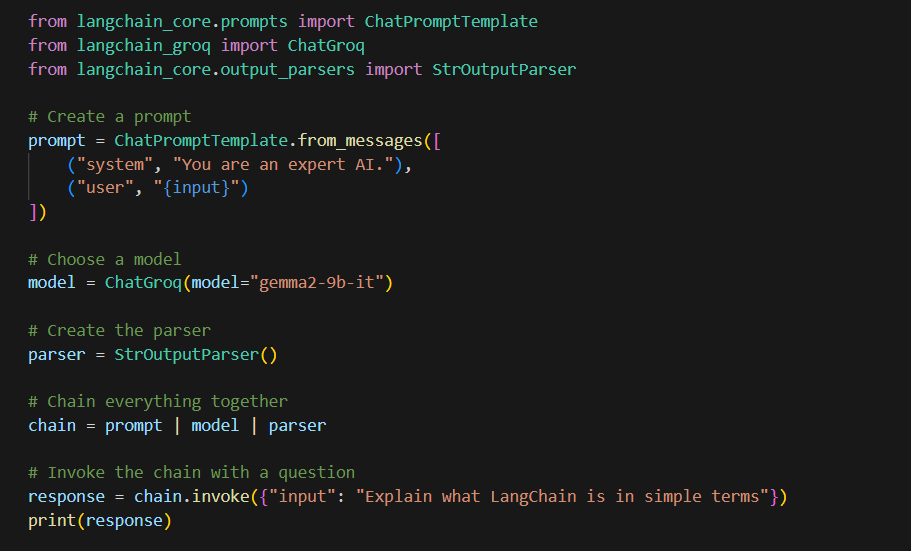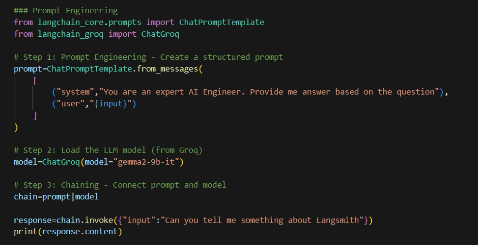 ChatOpenAI from langchain_openai, which allows us to connect to OpenAI’s chat models"o1-mini" — a lightweight and faster model.invoke() sends a prompt to the LLM.print(result) displays the output.Prompt Engineering is the process of designing structured inputs (prompts) to guide AI models to give accurate and relevant responses. In LangChain, we use ChatPromptTemplate to create prompts with specific roles like system and user. For example, we can instruct the AI to behave like an “expert AI Engineer” and respond to any user question accordingly. This makes the model’s output more targeted and professional.